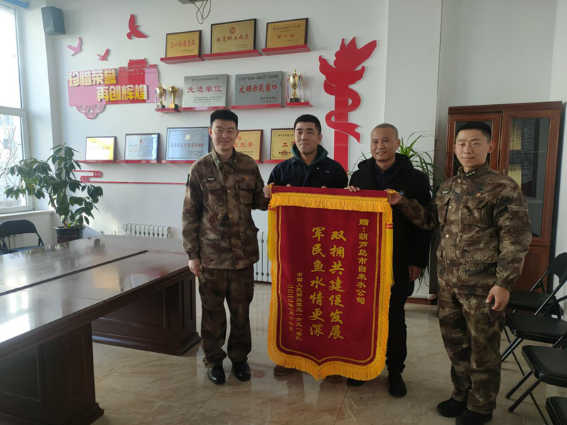 1月28日下午,駐葫某部領(lǐng)導(dǎo)專程來到自來水公司,對自來水公司在保障供水過程中提供的支持和幫助表示感謝,并送來錦旗。