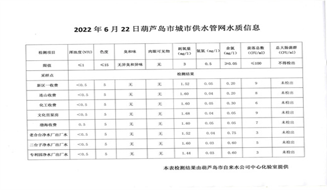 2022年6月22日葫蘆島市城市供水管網(wǎng)水質(zhì)信息