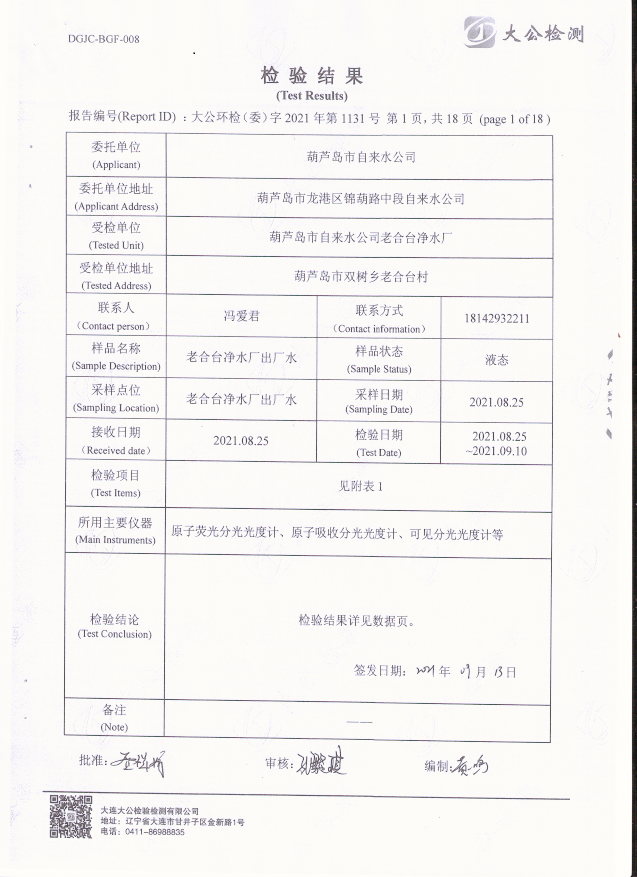 老合臺凈水廠出廠水質(zhì)檢驗(yàn)報(bào)告