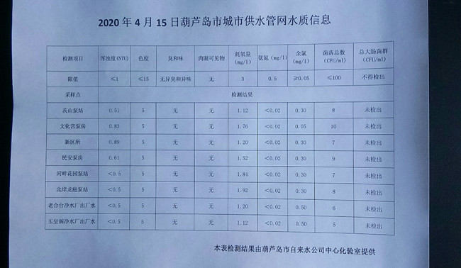 2020年4月15日葫蘆島市城市供水管網(wǎng)水質信息