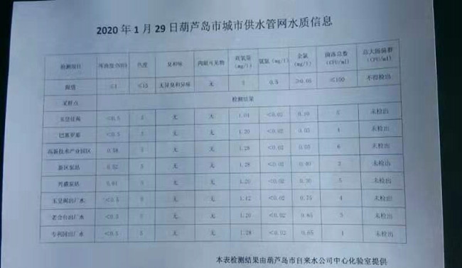 2020年1月29日葫蘆島市城市供水管網水質信息
