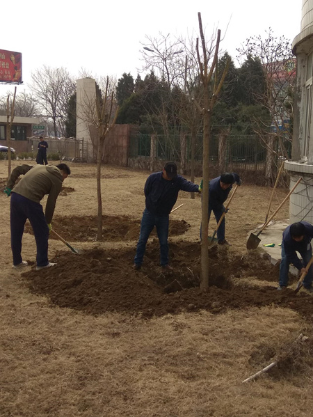 植樹現(xiàn)場,熱鬧非凡。大家分工協(xié)作,挖坑、鏟土、扛苗、扶苗、栽樹、蓋土、澆水等各環(huán)節(jié)都精心對待,各司其職,栽得認真,干得賣力,整個植樹活動現(xiàn)場一片熱火朝天的景象。本次植樹共計49棵,品種多樣,有欒樹、京桃、國槐、銀杏、海棠、玉蘭及中華李。
