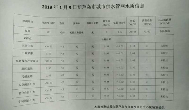 2019年1月9日葫蘆島市城市供水管網(wǎng)水質(zhì)信息
