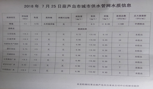 2018年7月25日葫蘆島市城市供水管網(wǎng)水質(zhì)信息