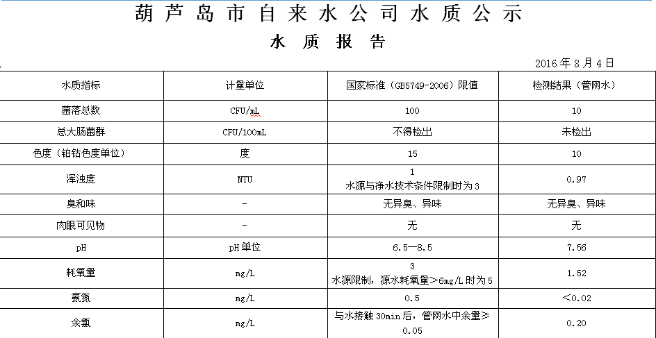 2016年8月第一周水質(zhì)報(bào)告