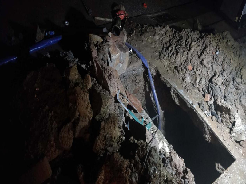 6月1日晚9點(diǎn),營(yíng)業(yè)二分公司接到維修工單,反映龍灣花園別墅區(qū)有幾戶家中無(wú)水,維修人員張井軍、齊德仁、曹哲禎迅速趕往現(xiàn)場(chǎng),測(cè)漏公司測(cè)漏員也到達(dá)現(xiàn)場(chǎng)。在初步確定漏水點(diǎn)后,維修人員開(kāi)始搶修。此處漏點(diǎn)管線很深,墊層較厚,都是大塊石頭,最大的可達(dá)200斤,給搶修造成很大難度。再加上夜間,發(fā)電機(jī)和電鎬工作時(shí)產(chǎn)生的噪音很大,周圍居民情緒很大。維修人員克服困難,經(jīng)過(guò)三小時(shí)的挖掘,呈現(xiàn)出一個(gè)寬1.4米、長(zhǎng)2.5米、深2米的作業(yè)坑,找到DN80熟鐵管線的兩處漏點(diǎn),維修人員熟練地上了兩個(gè)卡具后完成搶修。此時(shí)已經(jīng)是凌晨?jī)牲c(diǎn),維修人員清理現(xiàn)場(chǎng)后回到單位值班堅(jiān)守。