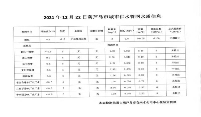 2021年12月22日葫蘆島市城市供水管網(wǎng)水質(zhì)信息