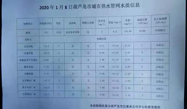 2020年1月8日葫蘆島市城市供水管網(wǎng)水質(zhì)信息