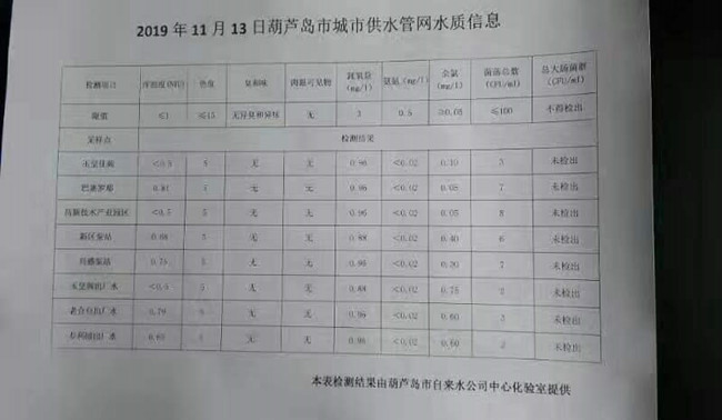 2019年11月13日葫蘆島市城市供水管網(wǎng)水質(zhì)信息