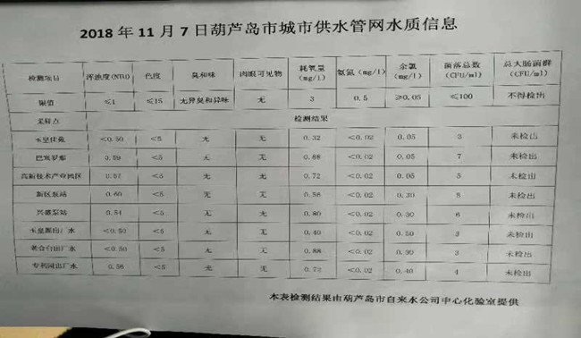 2018年11月7日葫蘆島市城市供水管網(wǎng)水質(zhì)信息