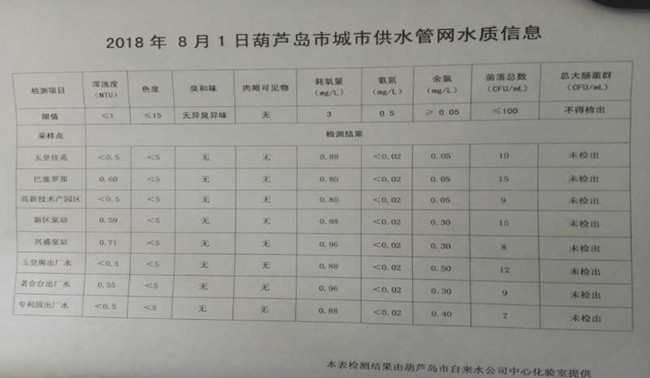 2018年8月1日葫蘆島市城市供水管網(wǎng)水質信息