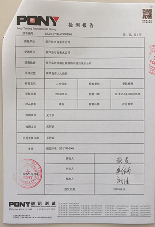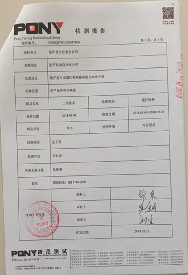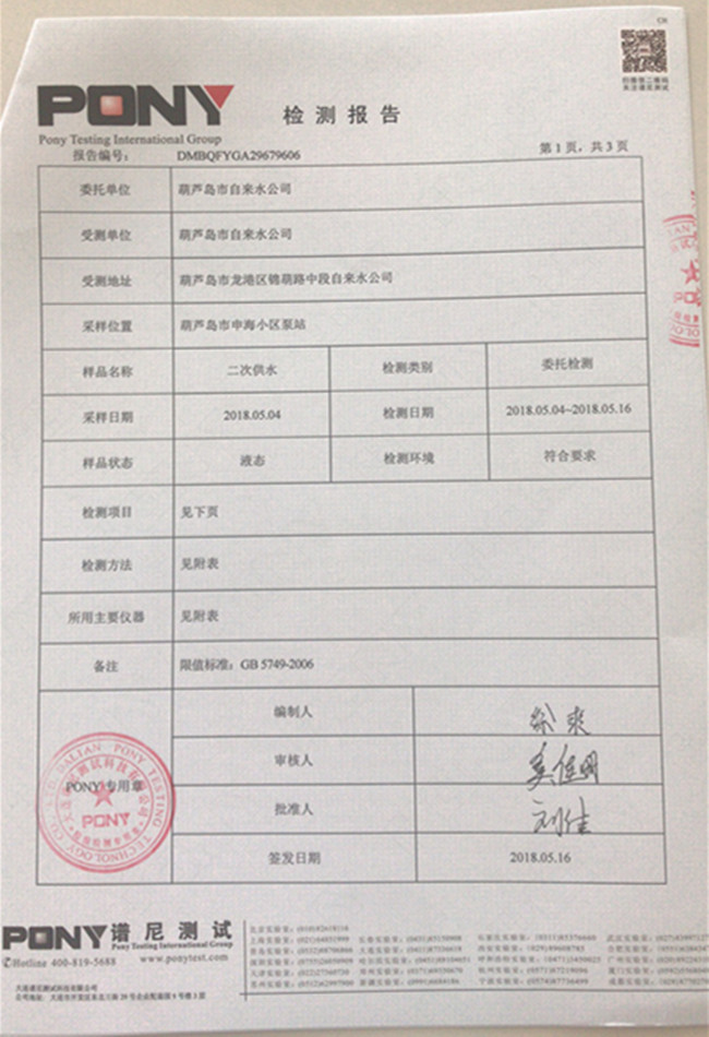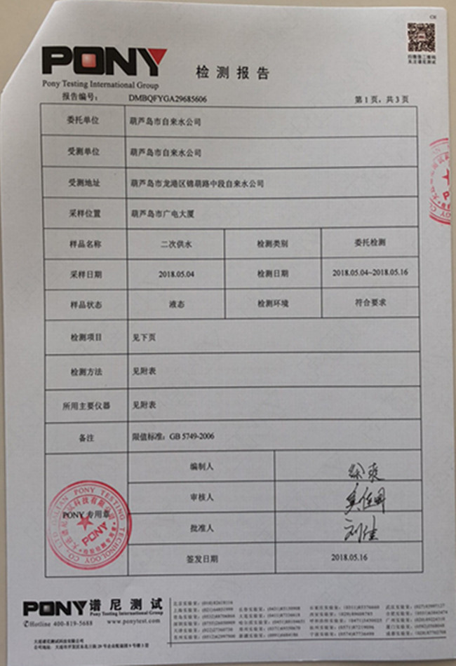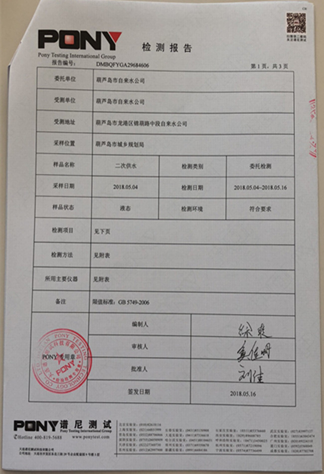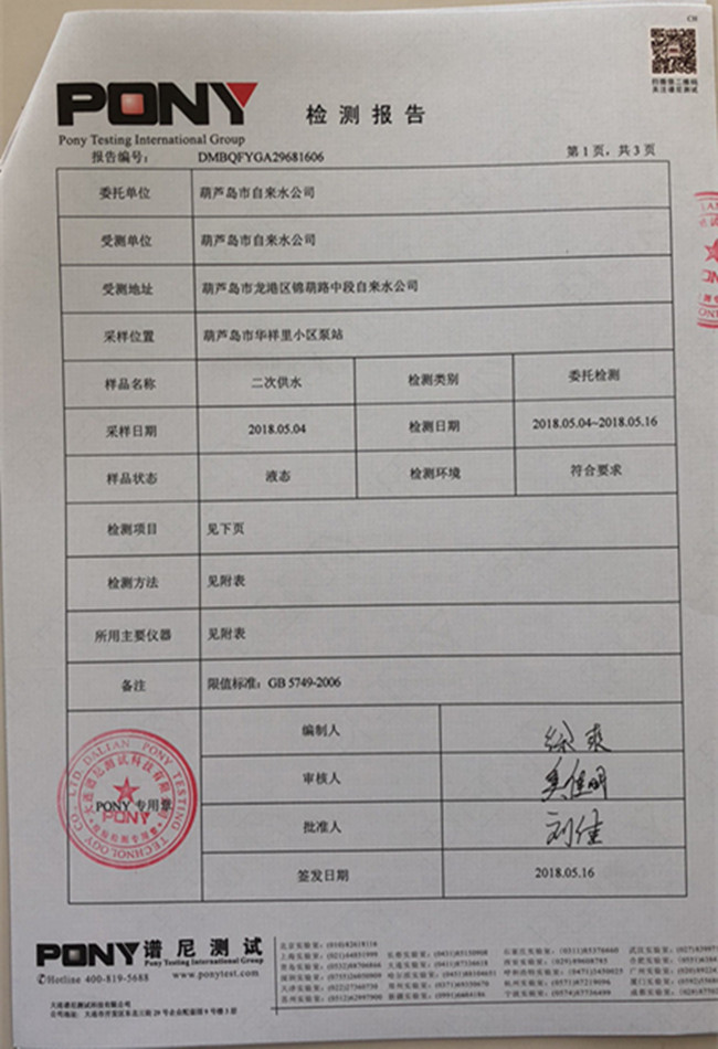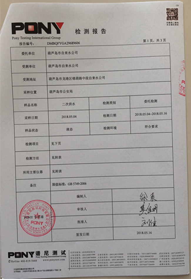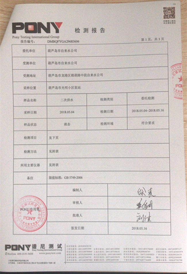 城鎮(zhèn)供水規(guī)范化管理水質(zhì)抽檢報告(報告日期:2018.05.16)